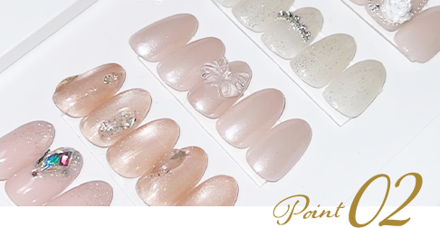 私自身10年以上の経験があり、ネイルに関するさまざまな資格を取得。お客様それぞれのお悩みや、ご要望に合わせたご提案を心がけています。またよりよいサービスをご提供したいという想いから、熱さが軽減される最新のライトを導入。現状に満足せずに、今よりさらにお客様に喜んでいただくためには、どうしたらいいかを考えています。